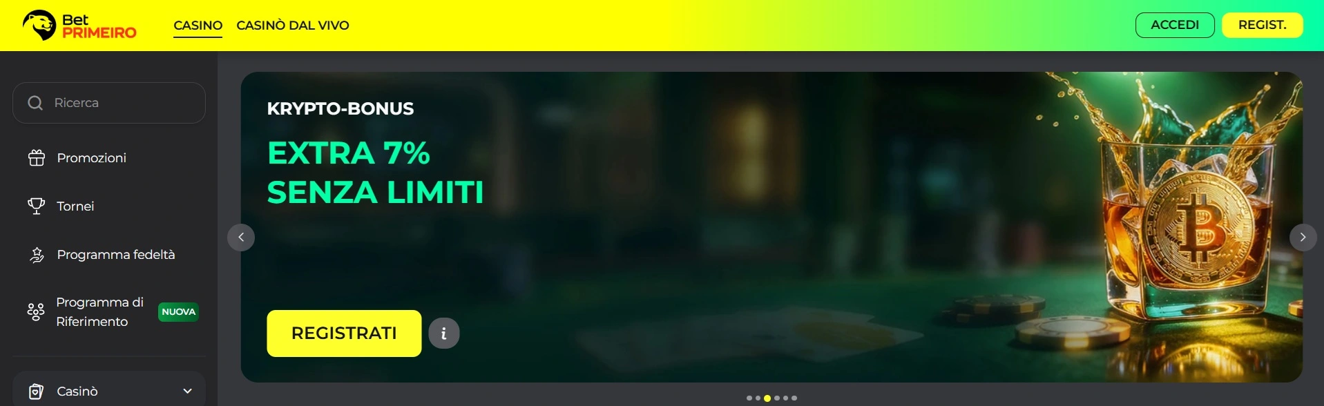 BetPrimeiro è un casino online fondato nel 2017 e gestito da Dama N.V. con licenza numero OGL/2023/174/0082 rilasciata dal Curaçao Gaming Control Board. BetPrimeiro permette la registrazione con sola email e metodo di pagamento, senza richiedere l’invio di documenti prima del primo deposito. Il catalogo conta oltre 6.000 giochi da più di 50 provider, tra cui Pragmatic Play, NetEnt e Microgaming, con una sezione live casino alimentata da Evolution Gaming e uno sportsbook integrato con mercati pre-partita e in-play. BetPrimeiro accetta carte Visa e Mastercard, portafogli elettronici come Neteller e Skrill, e criptovalute, con un deposito minimo di €20 e assistenza clienti disponibile 24/7 in italiano tramite chat dal vivo e email. Il bonus di benvenuto prevede fino a €750 in crediti bonus più 300 giri gratuiti distribuiti sui primi due depositi, con un requisito di puntata di 40x da completare entro 7 giorni.