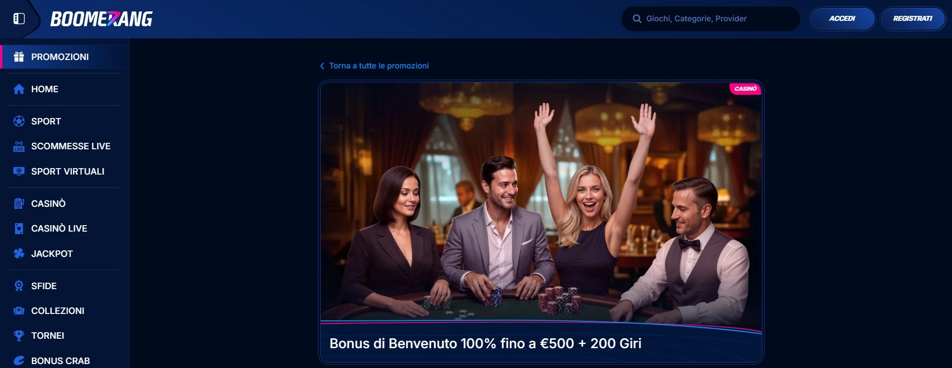 BoomerangBet è un casino online lanciato nel 2023 con licenza Anjouan che consente l’accesso ai giochi con soldi veri tramite una procedura di iscrizione che richiede solo email, password e dati di pagamento, con possibilità di registrazione anche tramite account Google o Telegram. BoomerangBet ospita più di 52 sport nel suo sportsbook con mercati pre-partita e in-play su calcio, basket, tennis ed eSports, oltre a un catalogo casino da provider come Pragmatic Play e NetEnt e una sezione live casino con oltre 297 tavoli. BoomerangBet accetta Neteller, Trustly, Visa e criptovalute, con prelievi elaborati entro 24–48 ore e un programma VIP a 5 livelli che include cashback, rakeback e un account manager personale dall’accesso al livello 3. Il bonus di benvenuto prevede il 100% fino a €500 più 200 giri gratuiti sul primo deposito, con un requisito di puntata di 35x sul bonus e 40x sulle vincite da giri gratuiti.