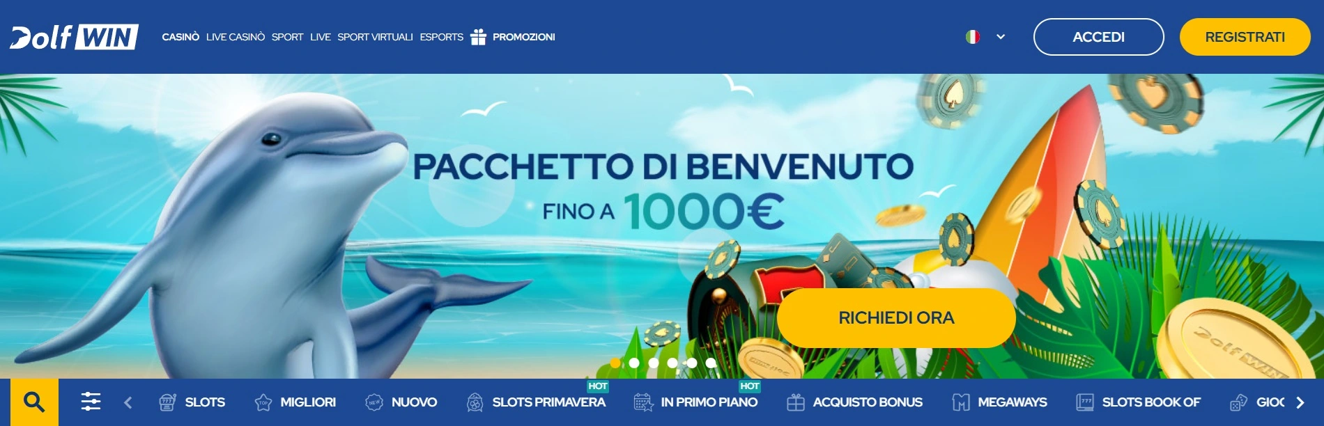 Dolfwin è un casino online fondato nel 2023 e gestito da NewEra BV con licenza eGaming di Curaçao, che permette di accettare giocatori internazionali senza procedura KYC obbligatoria prima del deposito. Dolfwin mette a disposizione oltre 3.000 giochi da più di 50 provider, tra cui Pragmatic Play, Play’n GO, Hacksaw Gaming, Nolimit City e Relax Gaming, con una sezione live casino e uno sportsbook integrato. Il sito è ottimizzato per dispositivi mobili iOS e Android senza necessità di scaricare un’app separata. Dolfwin accetta carte di credito, e-wallet e criptovalute con elaborazione istantanea dei depositi e prelievi in 1–7 giorni, e propone un pacchetto di benvenuto su 4 depositi per un valore complessivo fino a €1.000 più giri gratuiti, con requisito di puntata di 40x da completare entro 21 giorni.