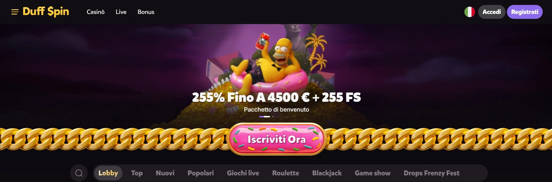 DuffSpin è un casino online lanciato nel 2025 e operato da Winner Tech Ltd con licenza Anjouan Gaming numero ALSI-202509029-FI1, che consente l’iscrizione senza invio di documenti di identità prima del primo deposito. DuffSpin mette a disposizione oltre 5.000 titoli tra slot, tavoli live, crash game e jackpot progressivi, forniti da Pragmatic Play, NetEnt ed Evolution Gaming. DuffSpin utilizza la tecnologia Progressive Web App (PWA), che permette di accedere all’intera offerta in modalità schermo intero direttamente dal browser dello smartphone senza installare nulla dagli store. Il programma VIP si struttura su livelli da Bronze a Platinum con accumulo di Wager Points e Deposit Points che sbloccano premi progressivi, condizioni di prelievo migliorate e assistenza clienti via chat dal vivo attiva 24 ore su 24.