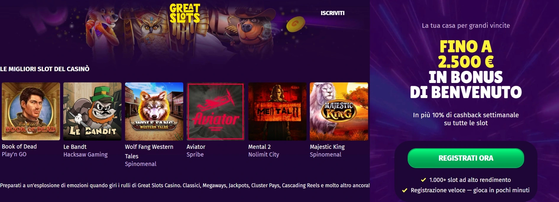 GreatSlots è un casino online gestito da Fortune Forge Limited, attivo dal 2020 con doppia licenza Anjouan Gaming e Costa Rica, che accetta giocatori dall’Italia senza richiedere l’invio di documenti prima del primo deposito. GreatSlots offre oltre 2.250 giochi da cinque provider principali – Pragmatic Play, NetEnt, Evolution Gaming, Spinomenal e Betsoft – con una sezione live casino che include oltre 150 tavoli attivi 24 ore su 24, con limiti da £1 fino a £10.000 per i tavoli VIP. GreatSlots accetta Bitcoin, Ethereum e Tether oltre ai metodi tradizionali, con prelievi via e-wallet entro 24 ore, un limite mensile di €20.000 e un bonus di benvenuto fino a €1.000 affiancato da un cashback settimanale del 10% sulle perdite nette. Il supporto clienti è disponibile in italiano, inglese e olandese tramite chat dal vivo con tempi di connessione medi inferiori a 60 secondi.